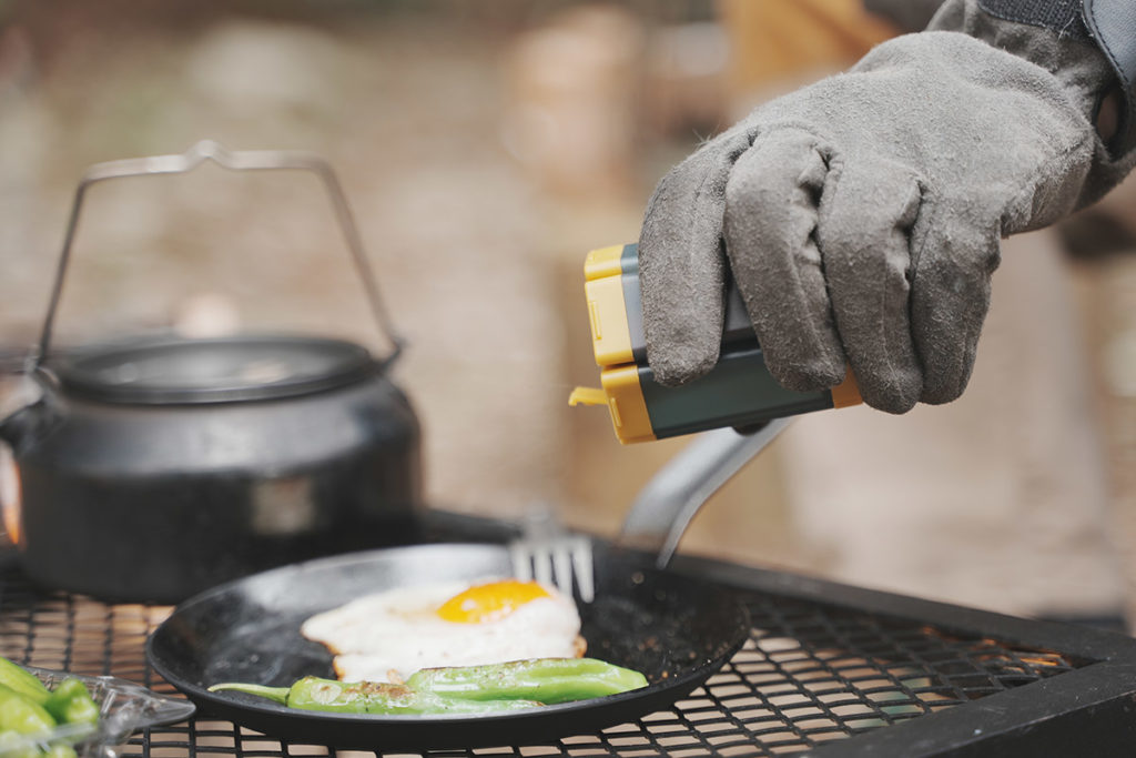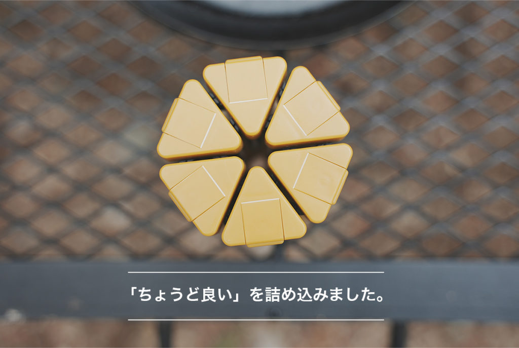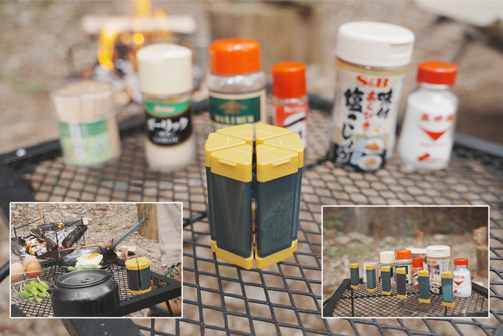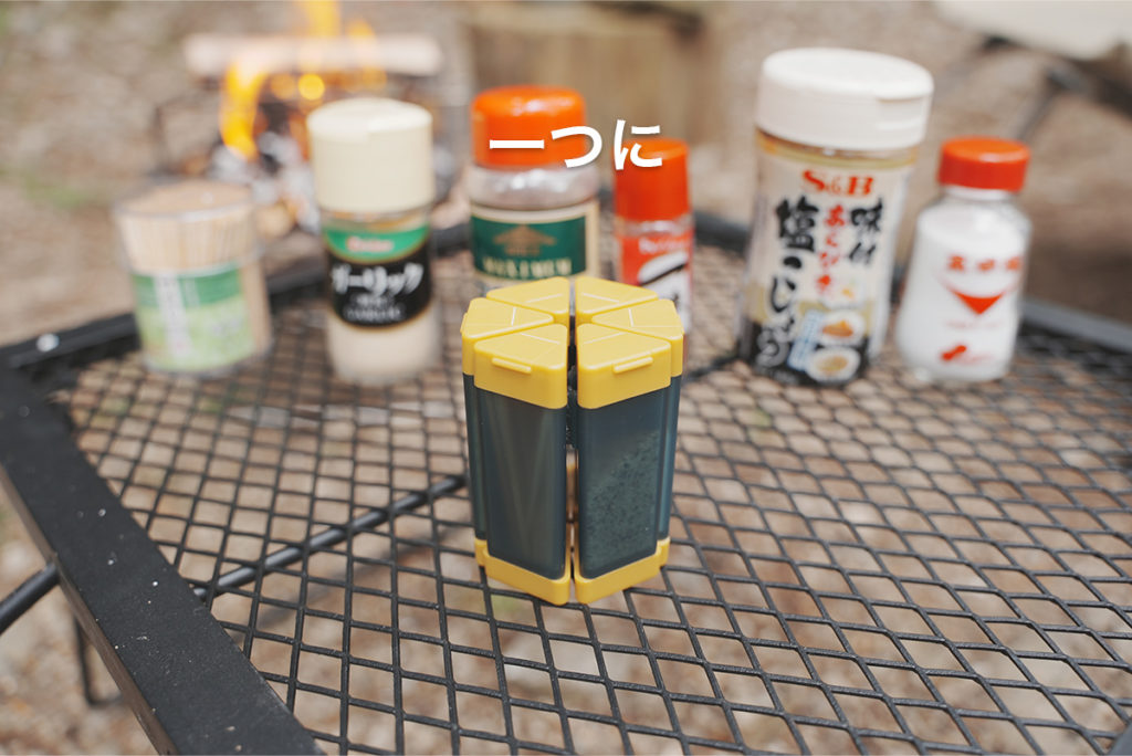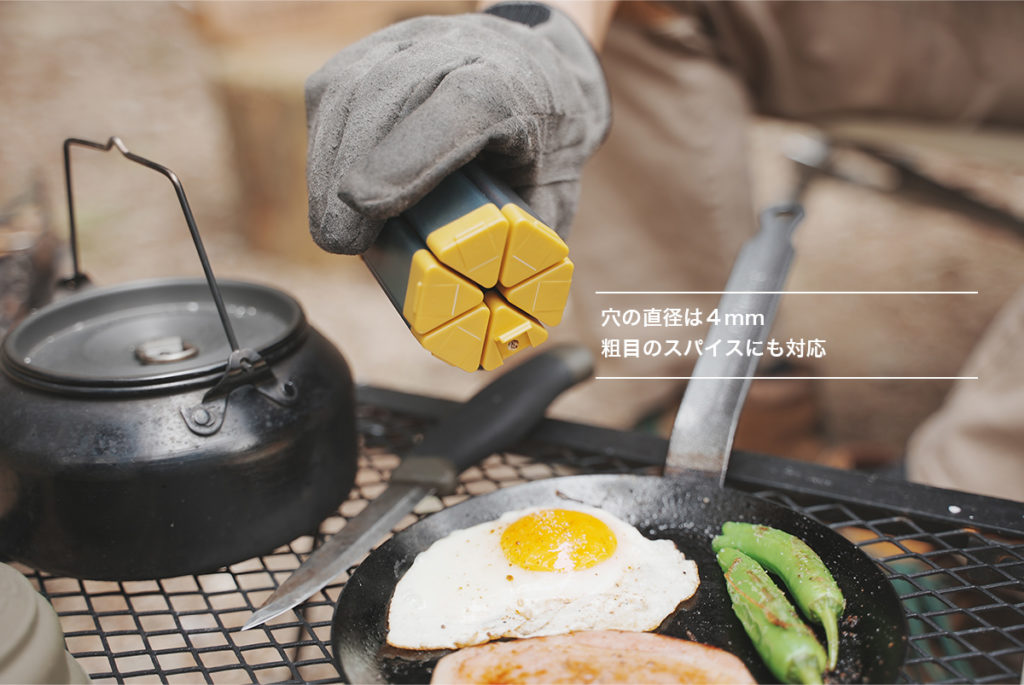 アウトドアで楽しむ料理は格別!でも調味料やスパイスはかさ張るし使わない事も多い…。使い切れないので量もいらない…という悩みを解決するスパイスボックスを開発しました。特許構造によりそれぞれが連結・自立し、まとめるとヘキサ型の1つの形に。2年の開発を経てへようやく完成に至りました。日常使いでもお勧めの商品です。